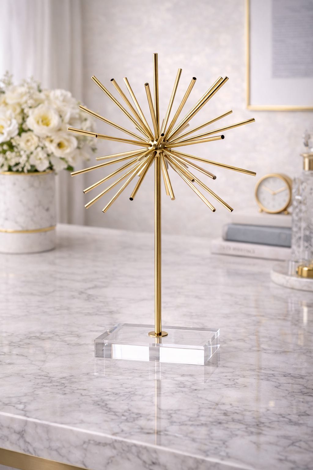 This metal sculpture showcases vertical rods protruding from a sphere in the centre, creating a captivating visual appeal. The lustre of the metal is counterpointed by the simplicity of the acrylic plinth base.