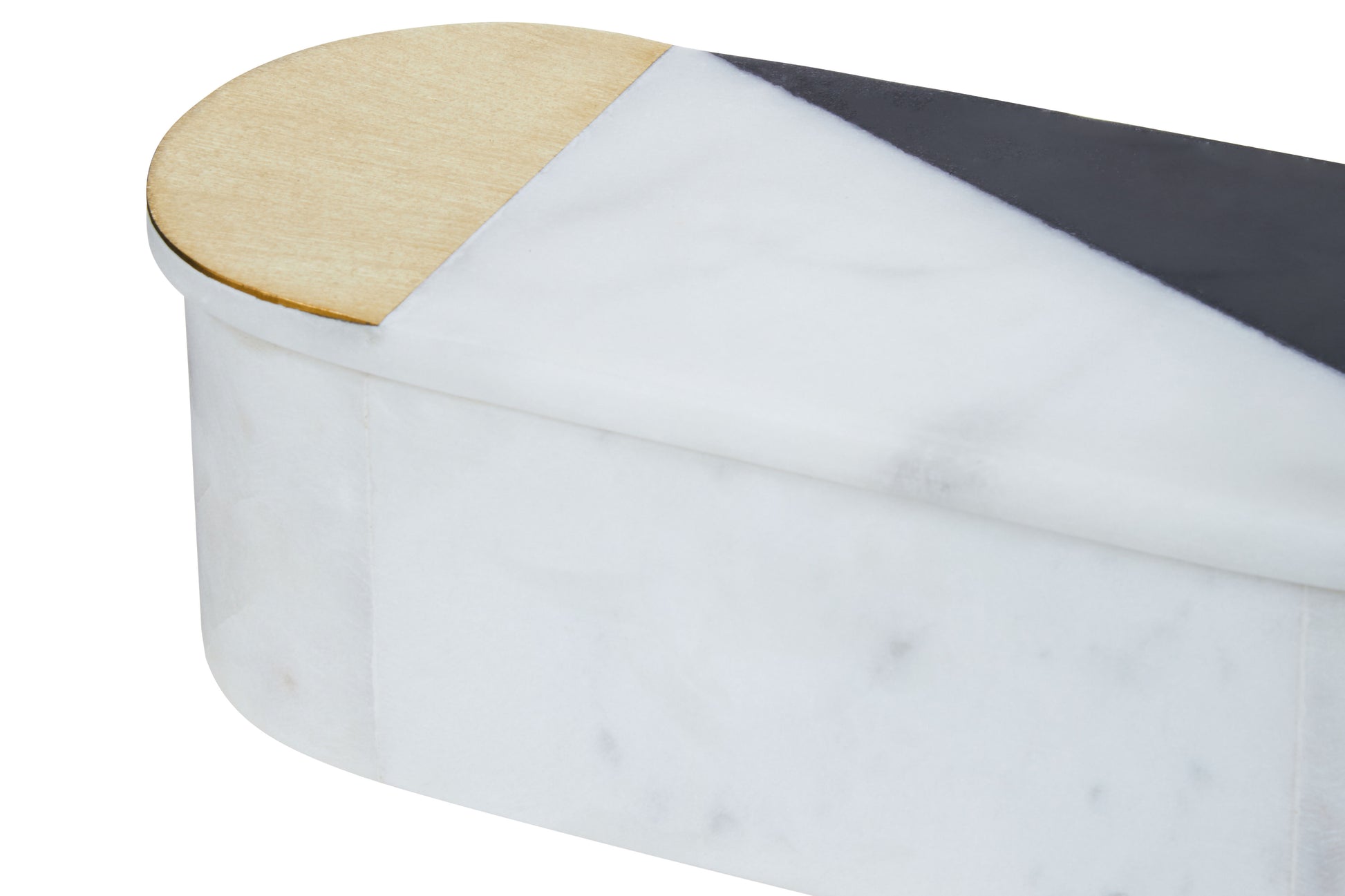 The Omari white oblong marble trinket box is an exquisite work of art with a gorgeous three colour combination cover of white and black marble separated by gold finish inlays. The box adds a touch of elegance with its minimalist design.